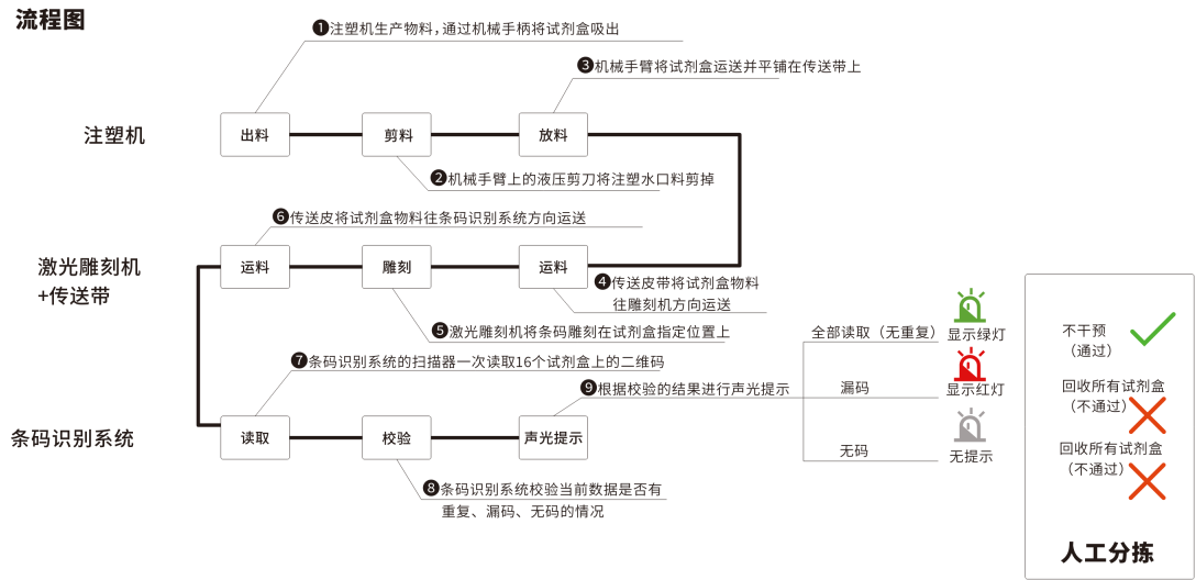 工業(yè)讀碼器與抗原試劑盒激光雕刻生產(chǎn)讀碼校驗(yàn)方案,在不影響當(dāng)前抗原試劑盒的生產(chǎn)速度的同時(shí),新增的激光雕刻二維碼和讀碼校驗(yàn)方案,可以有效確保一碼一盒的唯一性,發(fā)放到居民手里的抗原試劑盒擁有唯一標(biāo)識(shí)二維碼,居民自測(cè)上傳的檢測(cè)數(shù)據(jù)與個(gè)人信息匹配,加強(qiáng)了新型冠狀病毒抗原檢測(cè)應(yīng)用方案實(shí)施的可靠性。